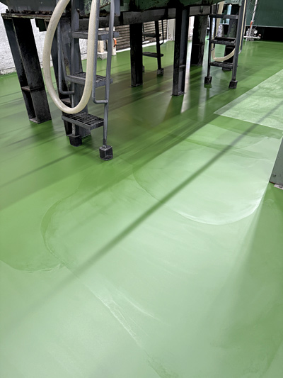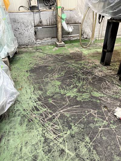 今回の工事ではユークリートMFを使用。床は、酸性液による部分的な侵食が確認されたため、