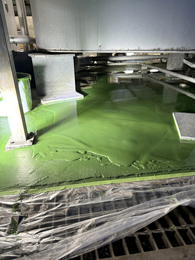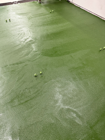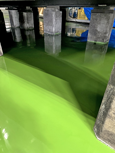 有機酸の影響でコンクリートが劣化し、溜池のような状態です。