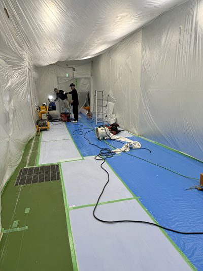 工場が稼働している中での施工となるため、作業エリアをテント式に養生し、