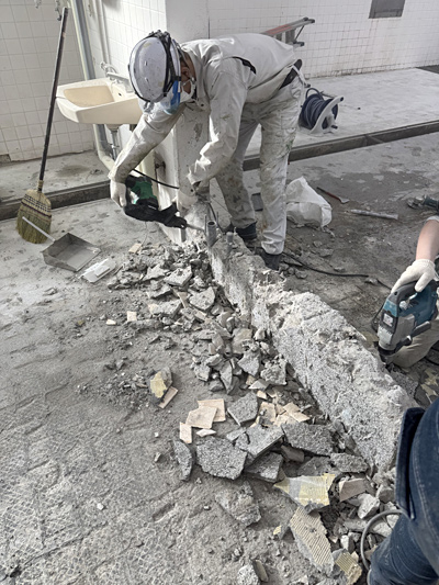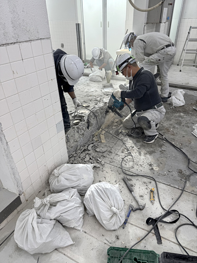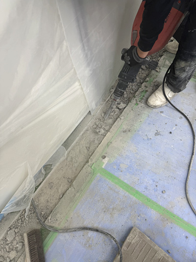 全面テント養生をし、正確な墨出し作業のもと、カッター入れ・斫り作業を丁寧に実施。
