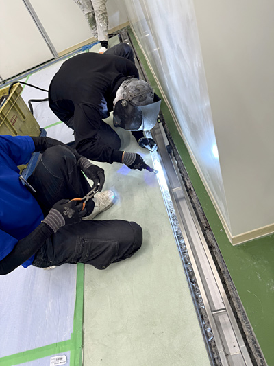 その後、ステンレス側溝の設置および溶接作業を行い、グラウト材での埋め戻しを経て、