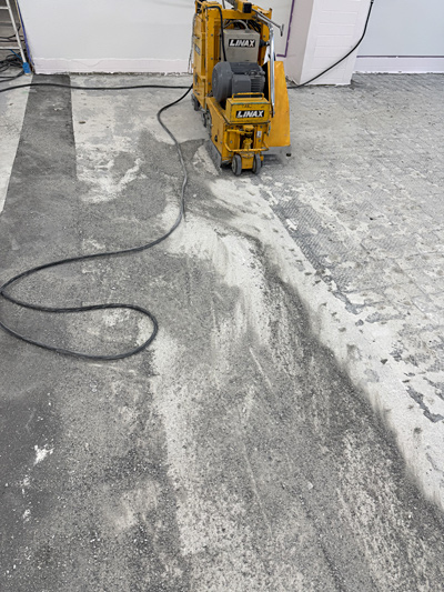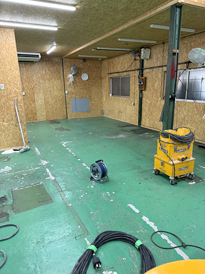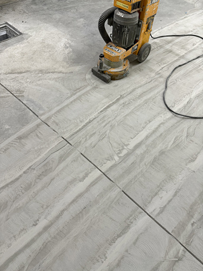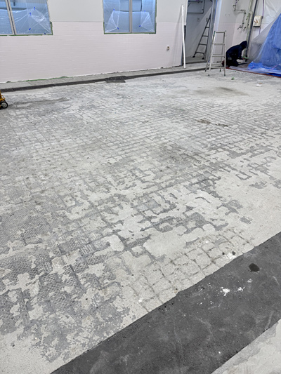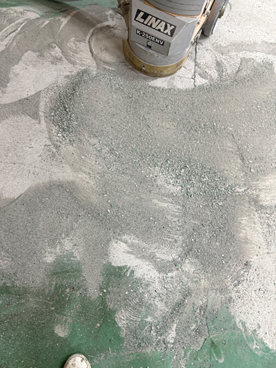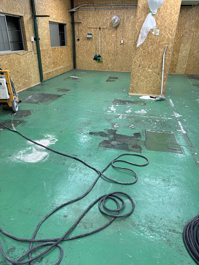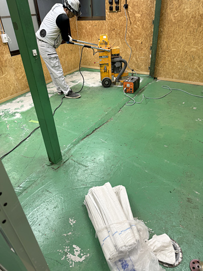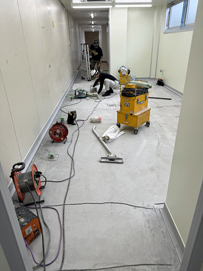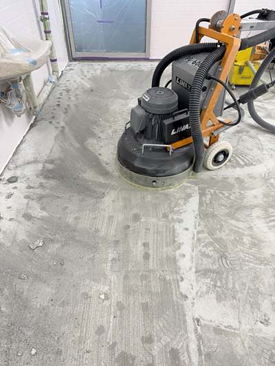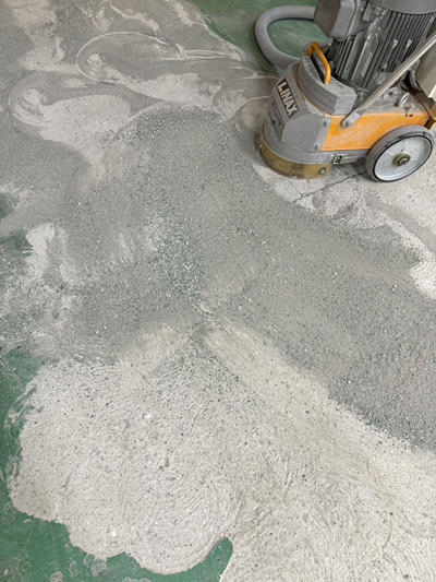 既存床に劣化や段差、欠損部が見られたため、大型研磨機を使用した下地処理を行い、床面を均一に整えました。
