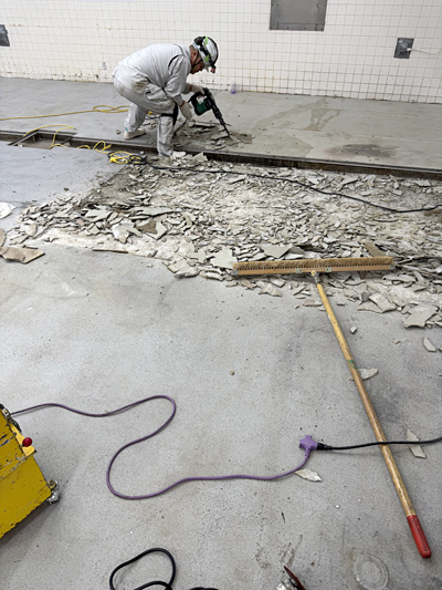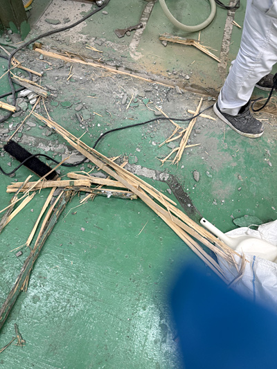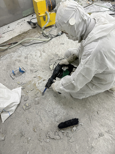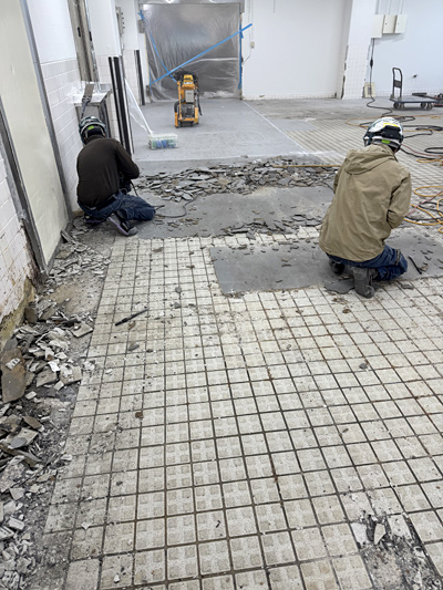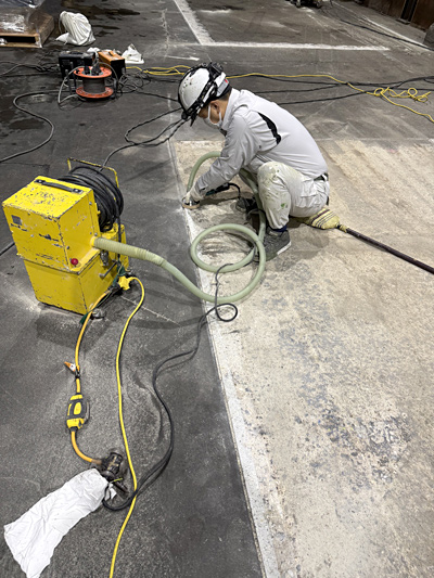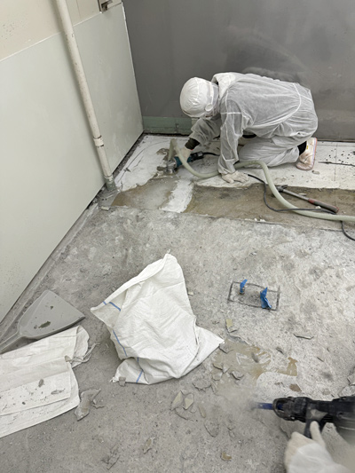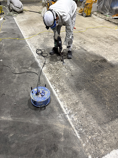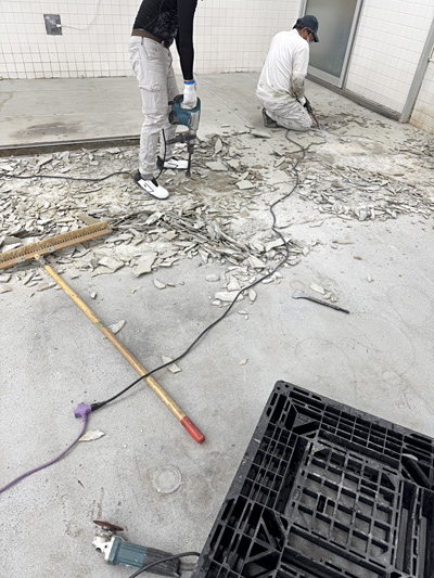 既存床の劣化や厚膜部分を、養生後にサンダー掛けによる下地処理を行い、状態の悪い箇所はハンマードリルにて撤去。