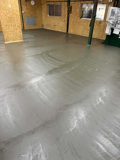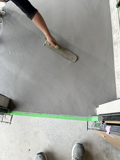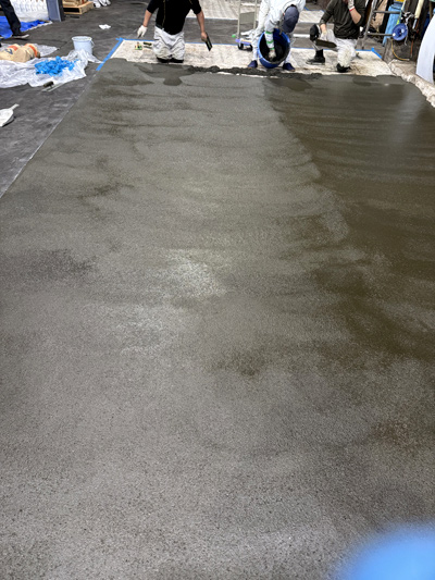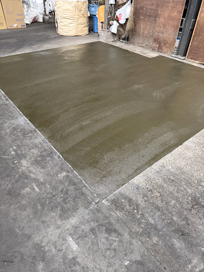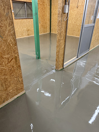 その後、ユークリートUD200SRを用いた下地施工と部分的な補修を行い、仕上げ塗りで床面を平滑に整えました。