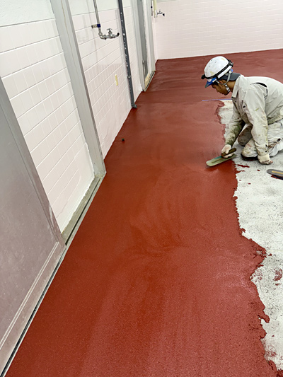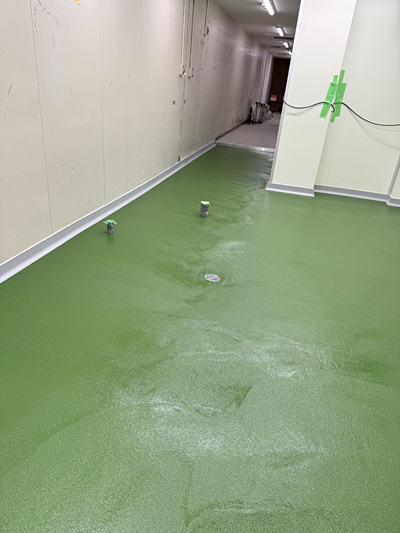 その後、ユークリートUD200SRによる仕上げ塗りを行い、立ち上がり部分には巾木RG仕上げを施工。耐久性と衛生性に優れた床環境を実現しています。