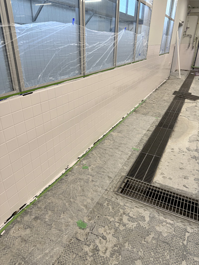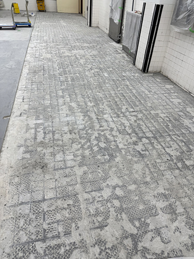 既存床の養生後、旧塗膜の撤去および下地処理を行い、床面の不陸や劣化部分を塗床施工に適した状態まで調整しました。